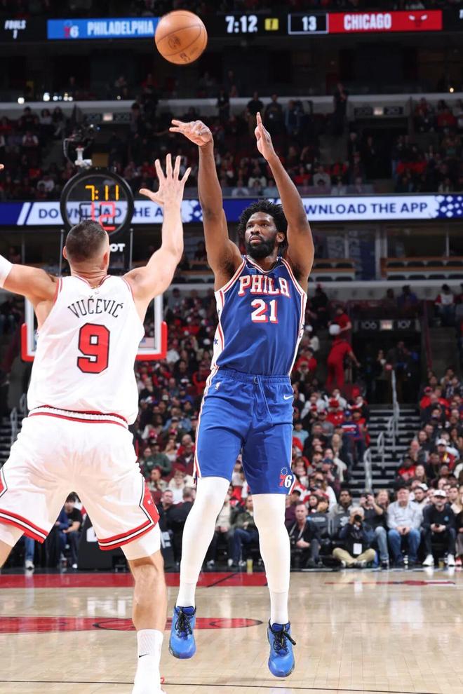 前三節(jié)還好,尤其上半場,恩比德拿了18分,他與馬克西兩人就合砍40分,而公牛全隊得分不過56分,火力之猛確實(shí)難以阻擋。