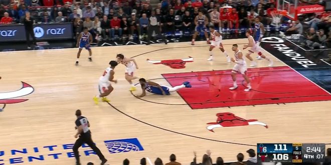 ——第六個進(jìn)攻回合,恩比德又拿球單挑武切維奇,被武切維奇搶斷